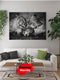 Embellece tu sala de estar con esta emotiva fotografía en blanco y negro que captura un momento íntimo entre una familia de leones. La imagen muestra a dos leonas acurrucadas cariñosamente con su cachorro, transmitiendo un fuerte sentido de amor y protección. La textura y el detalle de los leones, junto con el contraste en blanco y negro, crean una pieza poderosa y elegante que resalta cualquier decoración moderna. Colgada sobre un sofá blanco con cojines oscuros y verdes, la fotografía añade un toque de sofisticación y una conexión natural a tu espacio interior.