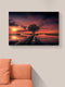 Este cuadro decorativo captura un escenario sereno y poético de un puente enmarcado por lagos, con un árbol solitario en medio, evocando una sensación de paz y contemplación. La puesta de sol, con el sol sumergiéndose en las nubes y el cielo teñido de morado, rosa y naranja, aporta un aura mágica y casi etérea al paisaje. La mezcla de colores del atardecer se refleja en los lagos, uniendo el cielo y la tierra en un espejo de color. El resultado es una oda a la belleza efímera y perpetua de la naturaleza en su transición hacia la noche.