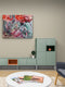 Esta pintura abstracta despliega una vibrante mezcla de colores y texturas, creando un torbellino de emociones visuales. Predominan los tonos rojos y rosas intensos en la parte superior, simulando flores o explosiones de color que parecen flotar sobre un fondo de tonos más fríos en verde agua y azules suaves. La aplicación de la pintura es dinámica y gruesa, con pinceladas audaces y salpicaduras que añaden profundidad y movimiento a la obra. Las transiciones de colores y las variadas texturas invitan al espectador a interpretar libremente la escena, explorando los límites entre la representación figurativa y la abstracción.
