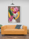 El cuadro revela un contraste intrigante entre el fondo terroso y cálido y el rostro femenino que emerge, cual diosa de la primavera, envuelto en flores rosadas y carmesí. Las hojas verdes aportan frescura y vida, balanceando la paleta cromática. Esta composición conjuga lo etéreo de la naturaleza con la belleza humana, sugiriendo una fusión entre la mujer y el mundo natural, en una danza de colores y sensaciones.