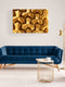 La imagen muestra un patrón geométrico tridimensional que juega con la percepción y la profundidad, creando una ilusión de estructura arquitectónica. Los tonos dorados aportan una sensación de lujo y calidez, reflejando la luz de manera que resalta las distintas facetas de las formas angulares. Esta pieza podría interpretarse como un estudio sobre la luz y la sombra, así como un comentario sobre la intersección entre el arte y el diseño industrial. El patrón repetitivo y la uniformidad del color dorado también evocan conceptos de opulencia y orden en un estilo contemporáneo y minimalista.