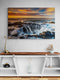 Esta fotografía captura el fenómeno natural espectacular de un sumidero marino, donde el agua se precipita en un torbellino entre rocas costeras al atardecer. La larga exposición suaviza el fluir del agua, creando un efecto sedoso que contrasta con la dureza de las rocas volcánicas. El cielo al anochecer se tiñe con tonos cálidos de naranja y amarillo, reflejando la luz del ocaso sobre el escenario dinámico del océano. Este momento etéreo evoca una conexión profunda con las fuerzas naturales y la majestuosidad del paisaje marino.