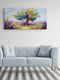 Este cuadro decorativo animado presenta un universo lleno de energía y vitalidad. El cielo azul proporciona una tranquila y serena tónica de fondo que contrasta maravillosamente con la vegetación verde vibrante. Un árbol se erige como una figura central, sus hojas compuestas de una mezcla atractiva de verdes, azules y toques de rosa, representando una alianza entre lo real y lo fantástico. La elección de los colores y el estilo animado confieren a la obra un ambiente lúdico y soñador, invocando un sentido de la maravilla y la imaginación.