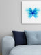 El cuadro presenta una estética minimalista, destacada por su fondo blanco puro. La mariposa azul, con sus tonos vibrantes, emerge como el foco central, simbolizando libertad y transformación. La elección del azul evoca sensaciones de tranquilidad y profundidad. La composición equilibrada y la paleta limitada realzan la belleza y simplicidad del sujeto.