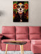 Esta obra captura la esencia del Día de los Muertos con una representación vibrante de una Catrina, símbolo icónico de la tradición mexicana. El rostro pintado con detalles intrincados en colores brillantes y contrastantes, como verdes, rojos y naranjas, se complementa con flores exuberantes y aretes ornamentados que enmarcan su rostro. El cabello oscuro fluye hacia un fondo lleno de tonos cálidos y destellos, evocando la conexión entre la vida y la muerte en una atmósfera mágica. Ideal para quienes buscan arte que combine cultura, tradición y estilo moderno, esta pieza es perfecta para añadir un toque audaz y significativo a cualquier espacio.