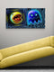 Este cuadro decorativo presenta una reinterpretación vibrante y digital del icónico videojuego Pac-Man. La obra utiliza una estética futurista con trazos de neón y un contraste intenso entre los tonos azules y amarillos, evocando la energía de un circuito electrónico. El personaje principal y el fantasma adquieren un estilo tridimensional, casi caricaturesco, que transmite dinamismo y movimiento, como si emergieran de la pantalla. El fondo en forma de circuito resalta la fusión entre lo retro y lo moderno, convirtiendo la pieza en un tributo pop contemporáneo al mundo gamer.