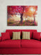 Esta cuadro decorativo, representa un bosque de árboles grandes, cubiertos de hojas rojas intensas, sugiriendo la estación otoñal. La densidad y altura de los árboles proporcionan un sentido de majestuosidad y permanencia, contrastando con la fugacidad implícita en sus hojas rojas. La presencia de arbustos con tonos cálidos añade una capa de riqueza y textura visual a la composición, aportando un contraste de formas y volúmenes con el marco de los árboles. La representación captura el íntimo y eterno diálogo entre la naturaleza y el cambio, y nos invita a perder nuestro ojo y nuestra mente en su detalle y profundidad.